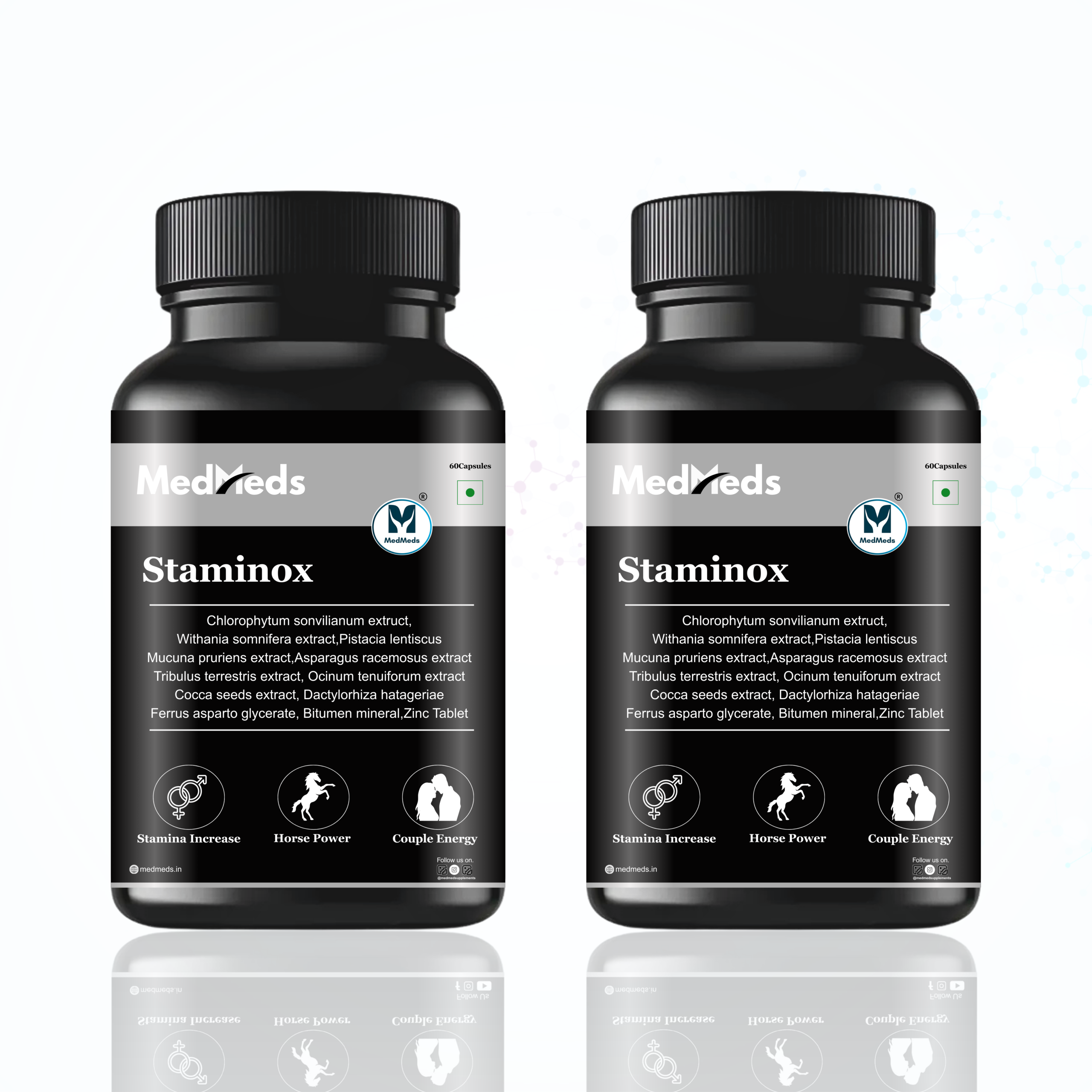 Staminox is a herbal vitality and stamina support supplement formulated with traditional performance-support botanicals. Its ingredients include Withania somnifera (Ashwagandha), Safed Musli, Mucuna pruriens (Kaunch Beej), Tribulus terrestris (Gokhru), Asparagus racemosus (Shatavari), Pistacia lentiscus, Cocoa extract, and Zinc.